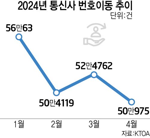 2일 한국통신사업자연합회(KTOA)에 따르면 4월 이동전화 번호이동 건수는 50만975건으로 전월(52만4762건) 대비 4.5% 감소했다. 3월부터 시행된 전환지원금 제도에도 불구하고 올 들어 가장 적은 번호이동수를 기록했다.