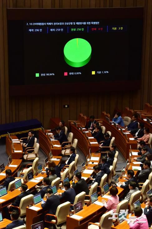 2일 서울 여의도 국회에서 열린 제414회국회(임시회) 제1차 본회의에서 '10.29이태원참사 피해자 권리보장과 진상규명 및 재발방지를 위한 특별법안'이 재석259인, 찬성256인, 반대0인, 기권3인으로 통과되고 있다.