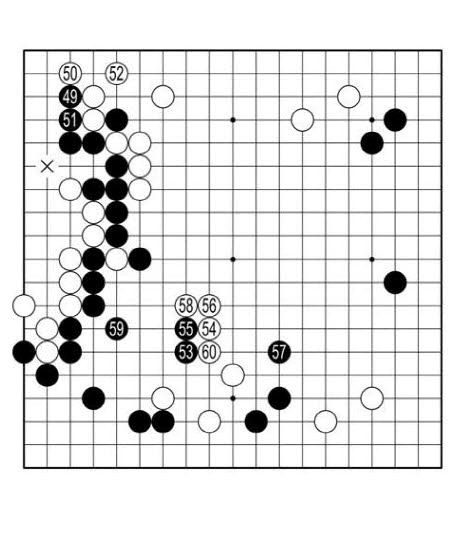 흑 '×'가 선수여서 49에 붙이는 수가 통했다. 하지만 49, 51로 별나게 얻은 것은 없다. 아래로 손을 돌려 흑53을 날렸지만 공격형이 아니었다. 흑57로 달아나고 59에 지키니 실제로는 수비형이었다.