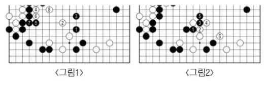 <그림1> 흑1 쪽을 두자니 백4로 나오면 거꾸로 위쪽 흑이 몰린다. <그림2>라면 백6 그물을 벗어나지 못한다.