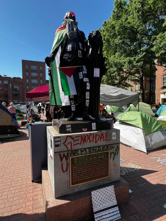 미 워싱턴DC 조지워싱턴대 캠퍼스 내에 있는 조지워싱턴 동상이 친팔레스타인 시위대에 의해 훼손된 모습./X |