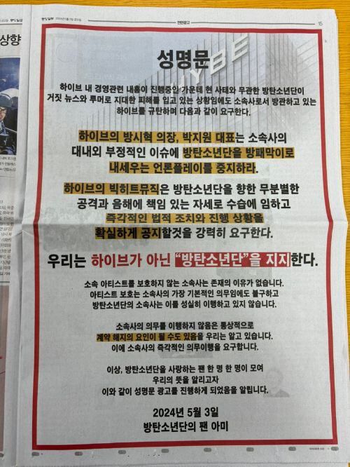 3일 가요계에 따르면 아미는 ‘방탄소년단의 팬 아미’의 명의로 일부 신문에 전면 광고 형식의 성명을 내고 “하이브와 빅히트뮤직은 방탄소년단을 향한 무분별한 공격과 음해에 책임 있는 자세로 수습에 임하고 즉각적인 법적 조치와 진행 상황을 확실하게 공지하라”고 요구했다.