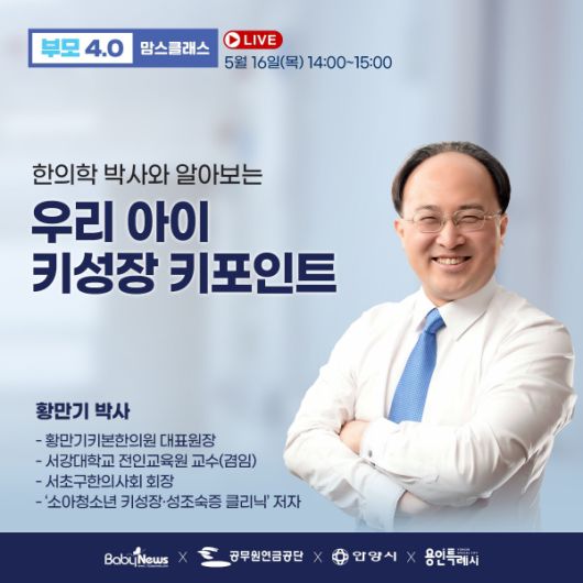 황만기 황만기키본한의원 대표원장이 베이비뉴스가 진행하는 부모4.0 맘스클래스 5월 라이브 방송에서 '한의학 박사와 알아보는 우리 아이 키성장 포인트'을 주제로 임산부, 육아맘들과 소통에 나선다.