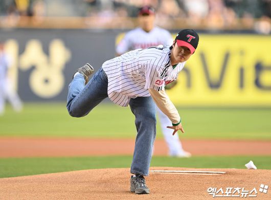 (엑스포츠뉴스 잠실, 박지영 기자) 3일 오후 서울 송파구 잠실야구장에서 열린 '2024 신한 SOL Bank KBO리그' 두산 베어스와 LG 트윈스의 경기에 앞서 배우 공명이 LG 승리 기원 시구를 하고 있다. 박지영 기자 jypark@xportsnews.com