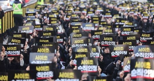 지난 2월 서울 을지로입구역 인근에서 교사들이 서이초 교사 순직 심의를 앞두고 도심 집회를 열고 있다. [연합] |