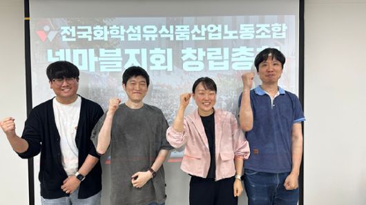 (왼쪽부터) 화섬식품노조 넷마블지회의 이상윤 사무장, 이정헌 부지회장, 이해미 지회장, 이정훈 수석부지회장. [사진=화섬식품노조 넷마블지회] |