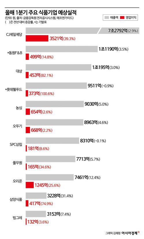 이 밖에 오리온과 SPC삼립, 빙그레 등 스낵, 제빵, 빙과 제조사들도 올해 1분기 실적에서 지난해 같은 기간보다 나아진 성적표를 받아들 것으로 예상됐다.