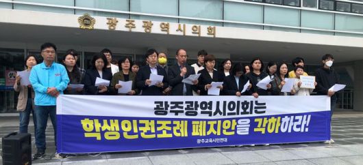 교육연대는 이날 오전 광주시의회 앞에서 기자회견을 열어 "학생인권조례 폐지 조례안이 접수돼 청구 요건을 충족했다"며 "청구인 명부가 공표된 상태이다. 만약 명부에 이상이 없고 이의가 없을 때 시의회 운영위원회에서 폐지안이 수리될 수 있다"며 이 같이 주장했다.