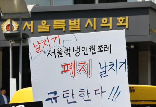 3일 서울 중구 서울시의회 앞에서 열린 서울 학생인권조례 폐지 반대 기자회견에서 날치기 폐지를 규탄한다는 팻말이 보인다. 뉴시스 |