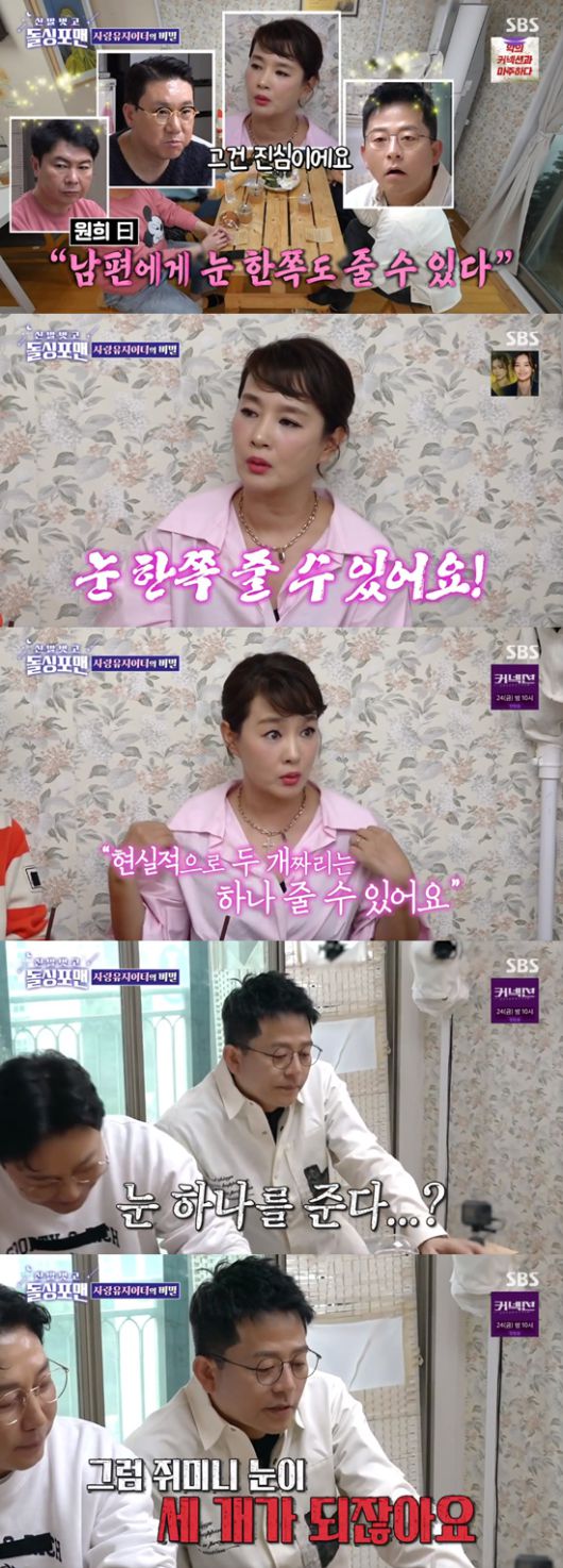 이상민은 "김원희 씨가 '남편에게 눈 한쪽도 줄 수 있다'고 했는데 사실이냐"고 질문했고, 김원희는 한치의 망설임 없이 "그건 진실"이라고 대답했다.