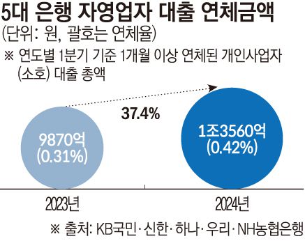 8일 금융권에 따르면 국내 5대은행(KB국민·신한·하나·우리·NH농협)에서 1개월 이상 연체된 소호 대출 총액은 올해 1분기 말 기준 1조3560억 원으로 집계됐다. 이는 지난해 1분기 말 9870억 원보다 3690억 원(37.4%) 증가한 규모다. 소호대출은 법인이 아닌 숙박·음식점업, 도소매업, 부동산임대업 등을 하는 자영업자들을 대상으로 한다.