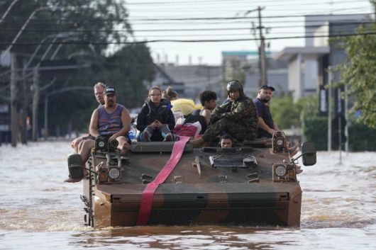 브라질 홍수에 투입된 군장갑차 브라질 최남단 히우그란지두술주의 주도인 포르투알레그리 시민들이 7일(현지시간) 폭우로 홍수가 난 시가지에서 군장갑차를 타고 이동하고 있다. 지난달 29일부터 시작된 폭우와 그에 따른 홍수로 히우그란지두술주에서는 90명이 사망하고 130여명이 실종됐으며, 약 15만명이 이재민이 됐다. AP연합뉴스 |