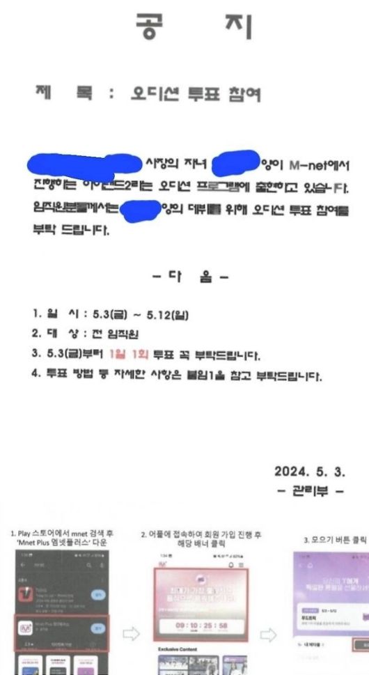 회사 측은 공지문을 통해 "사장의 자녀 ○○○양이 M-net에서 진행하는 '아이-랜드2'라는 오디션 프로그램에 출연하고 있다. 임직원분들께서는 ○○○양의 데뷔를 위해 오디션 투표 참여를 부탁드린다"고 당부했다.