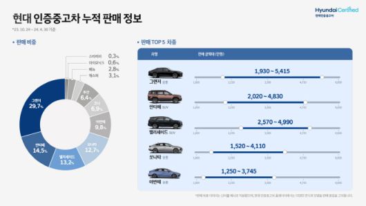9일 현대차에 따르면 지난달 말 누적 기준 그랜저가 현대 브랜드 인증중고차 전체 판매량의 29.7%를 차지했다. 싼타페(14.5%)·팰리세이드(13.2%)가 그 뒤를 이었다. 제네시스 브랜드 중에서는 G80(37.8%)·GV80(22.5%)·GV70(19.9%) 등의 순이었다.