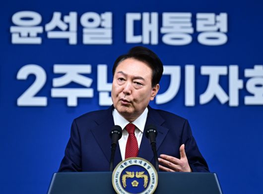 윤석열 대통령이 9일 서울 용산 대통령실에서 열린 윤석열정부 2년 국민보고 및 기자회견에서 기자들의 질문에 답하고 있다. [이승환 기자] |