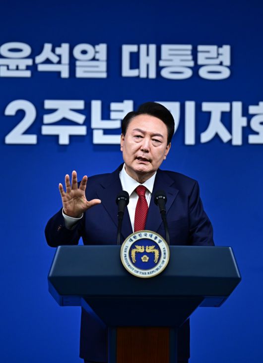 윤석열 대통령이 9일 서울 용산 대통령실에서 열린 윤석열정부 2년 국민보고 및 기자회견에서 기자들의 질문에 답하고 있다. 2024.05.09. 대통령실사진기자단 |