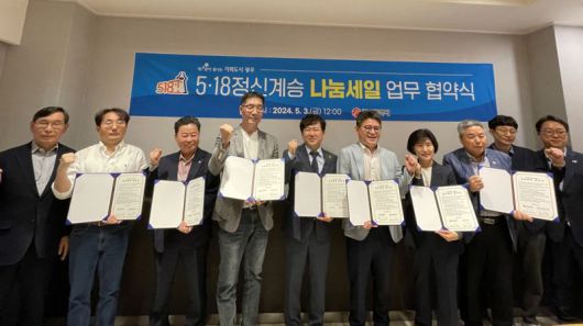 협약에 따라 상인 대표들은 △5·18기념주간에 나눔세일 행사 참여 △나눔세일 참여업체 홍보 및 홍보물 지원, 상품 구매 촉진 △5·18정신 계승사업 발굴·추진·참여를 위한 상시 협의 등 나눔·연대의 자랑스러운 '광주정신'을 계승하고 실천하기로 했다.