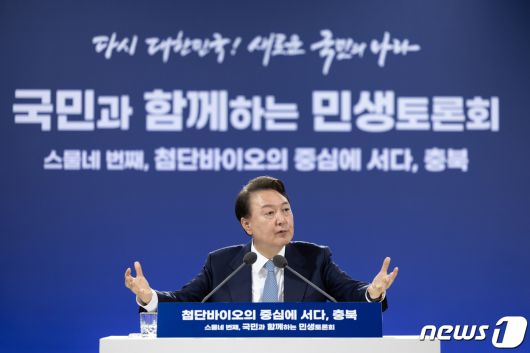 윤석열 대통령이 26일 충북 청주시 청원구 동부창고에서 '첨단바이오의 중심에 서다, 충북'을 주제로 열린 스물네 번째 국민과 함께하는 민생토론회에서 발언하고 있다. (대통령실 제공) 2024.3.26/뉴스1 ⓒ News1 오대일 기자 |