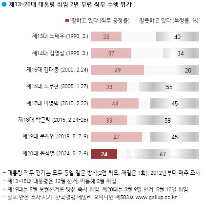 한국갤럽 조사 결과, 윤 대통령의 직무 수행 긍정률 24%는 제6공화국 출범 후 재임한 대통령들의 취임 2주년 지지율 중 가장 낮은 것으로 나타났다. [자료=한국갤럽] |