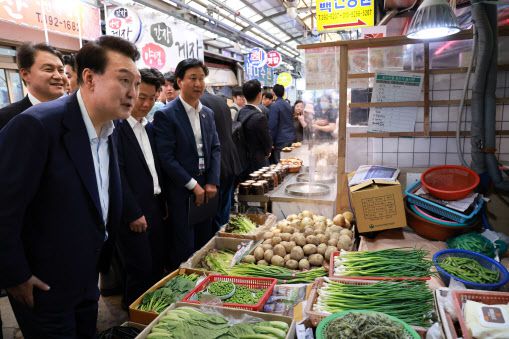 윤 대통령은 이날 채소, 과일 등을 판매하는 점포를 방문해 시장 상인들과 소통하며 가격 동향을 점검하고 장을 보러 나온 시민들에게 물가에 대한 의견을 듣기도 했다.