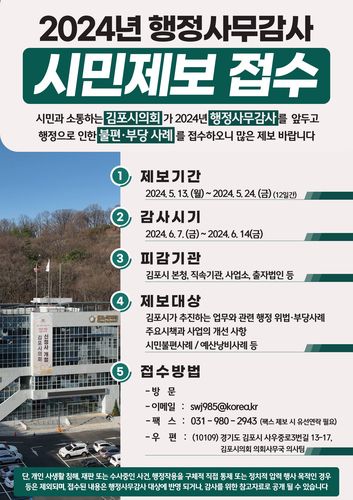 시민 제보는 김포시의회 의사팀을 방문하거나 우편 또는 이메일(swj985@korea.kr), 팩스(031-980-2943)로 접수할 수 있으며, 그 밖에 궁금한 사항은 의회사무국(031-980-2879)에 문의하면 자세한 안내를 받을 수 있다.