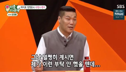서장훈은 "제가 웬만하면 누구한테 이런 이야기를 안 하는데"라며 임영웅에게 엄마를 위한 영상 편지를 부탁했다. 이에 임영웅은 "김정희 여사님 얼른 쾌차하셔서 콘서트장에 직접 한번 모시고 싶다. 얼른 쾌차하셔서 장훈이 형이랑 같이 콘서트장에서 뵀으면 좋겠다"라며 건강 회복을 기원했다.