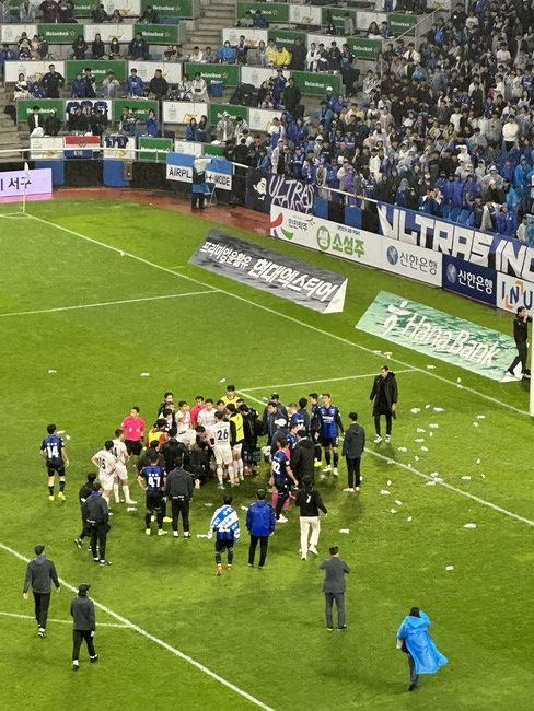 경기 종료 휘슬 후 문제가 생겼다. 백종범 골키퍼가 인천 서포터즈석을 향해 포효하는 세리머니를 펼쳤고, 이에 흥분한 인천 팬들이 물병을 그라운드에 투척했다. 이 과정에서 기성용의 급소를 타격하는 일이 벌어지기도 했다.