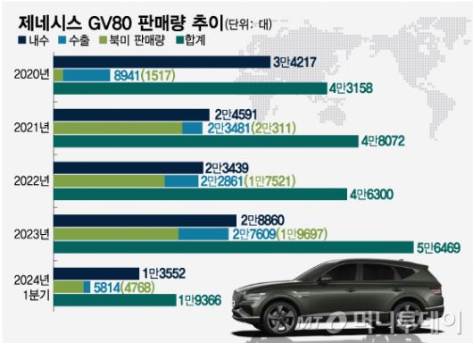 북미는 GV80 수출에서 가장 큰 비중을 차지하던 곳이다. GV80 수출 내 북미 비중은 2021년 86.5%(2만311대), 2022년 76.6%(1만7521대), 2023년 71.3%(1만9697대) 등으로 GV80 수출 물량의 대부분을 북미에서 소화했다. 올해 1분기 역시 수출 판매량의 82%에 달하는 4768대가 북미에서 팔리기도 했다.