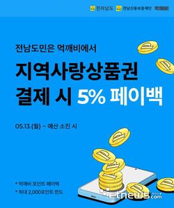 전남 공공배달앱 '먹깨비' 지역사랑상품권 결제 시 5% 페이백 이벤트. |