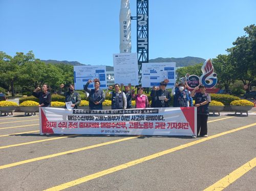 (창원·거제=연합뉴스) 정종호 기자 = 최근 경남 거제시 한 조선소 선박 수리 작업 중 일어난 폭발·화재와 관련해 민주노총 경남본부가 13일 도청 앞에서 기자회견을 열고 "사고가 일어난 이번 선박 수리 작업은 위험 관리가 전혀 되지 않는 유령 작업"이라고 주장했다.