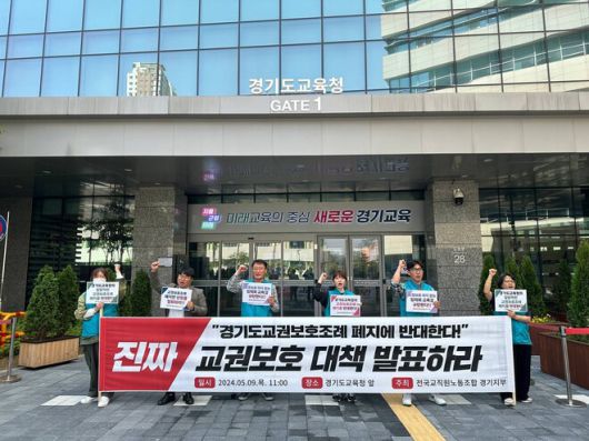 경기교사노동조합은 13일 경기도교육청 광교청사 앞에서 기자회견을 열고 “도 교육청이 추진 중인 통합 조례안을 보면, 교사의 교육활동보호와 학생인권 모두 현저히 축소했다”며 “통합 조례안에는 기존 교권보호조례에 있던 교육활동 침해행위에 대한 조처와 대응지원, 학생 분리교육, 민원대응지침, 행정업무경감 등이 모두 삭제됐다”고 밝혔다. 이어 “통합 조례안 제정과 이로 인한 교권보호조례 폐지를 강력하게 반대한다”고 주장했다.