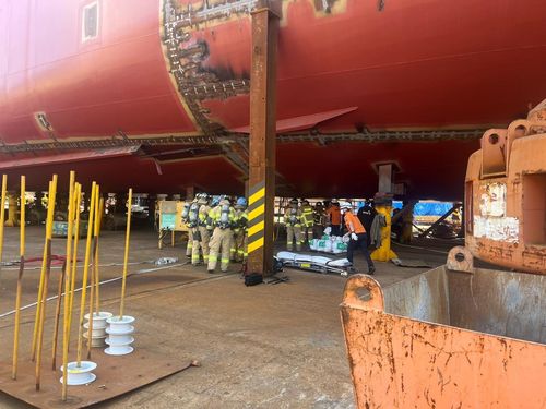 (부산=연합뉴스) 손형주 기자 = 13일 오후 2시 23분께 부산 사하구 다대동에 있는 조선소에서 건조 중인 컨테이너 운반선에서 불이 났다.