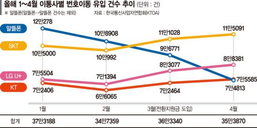 한국통신사업자연합회(KTOA)에 따르면 4월 번호이동 건수(알뜰폰→알뜰폰 제외)는 35만3870건이다. 이통3사 위주의 번호이동 건수가 증가했지만, 증가폭이 가파르지 않다. 반면, 알뜰폰 유입 건수가 눈에 띄게 감소하는 추세다. 방통위 관계자는 "이통사들도 현재 환경상 담합 조사 같은 현안이 있다 보니 전환지원금에 신경이 쓸 겨를이 부족한 것으로 보인다"며 "정부가 강제할 수 있는 사안은 아니며, 이통사와 제조사가 논의하고 있는 것으로 알고 있다"고 말했다.
