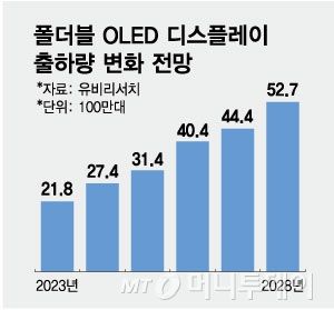 대만 시장조사업체 트렌드포스는 전세계 폴더블폰 출하량이 지난해 1830만대에서 2027년 7000만대로 늘어날 것이라 봤다. 전체 스마트폰 시장에서 폴더블 폰 비중이 1.6%에서 5%로 커지는 것이다. 이와 관련 또 다른 시장조사업체 유비리서치는 폴더블용 OLED 출하량이 올해 2740만대에서 2028년 5270만대까지 증가할 것으로 봤다. 최근엔 중국 화웨이와 아너 등이 진입하며 폴더블 폰 대중화에 기여했다.
