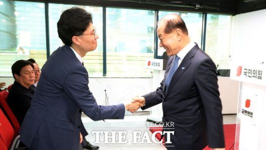 황우여 국민의힘 비상대책위원장이 14일 오전 서울 여의도 국민의힘 중앙당사에서 열린 총선백서 특별위원회 전체회의에서 조정훈(왼쪽) 총선백서 특위 위원장과 악수를 하고 있다. /뉴시스 |