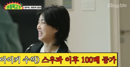 장성규는 "월 50만 원을 벌다가 매달 5000만 원씩 버는 기분은 어떠냐"라고 물었고, 아이키는 말 없이 웃음으로 답했다.