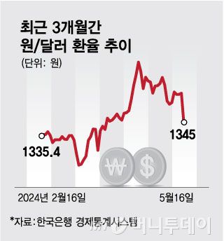 16일 서울외환시장에서 원/달러 환율은 전 거래일 대비 24.1원 내린 1345원에 거래를 마쳤다. 종가 기준으로 1340원대를 기록한 건 지난달 4일 이후 42일만이다.