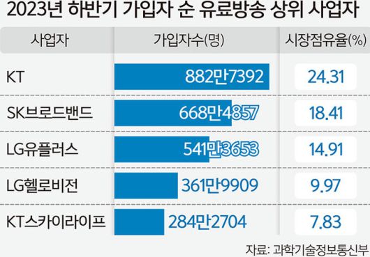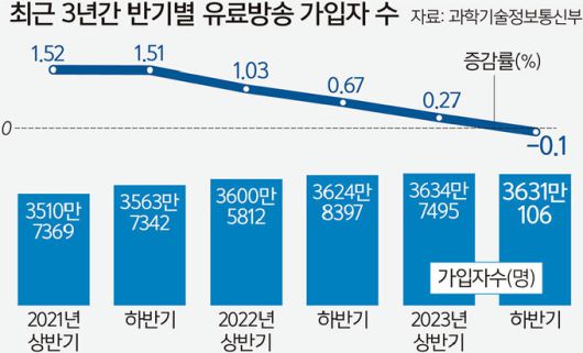 16일 과학기술정보통신부에 따르면 지난해 하반기 유료방송 가입자 수는 3631만106명으로 전년 상반기 대비 0.1% 감소했다. 이는 2015년부터 유료방송 가입자 수를 조사한 이후 첫 감소 기록이다.