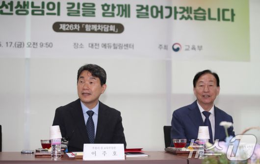 (대전=뉴스1) 김기태 기자 = 이주호 사회부총리 겸 교육부장관이 17일 대전 유성구 에듀힐링센터에 열린 제26차 함께차담회에서 인사말을 하고 있다. 이날 열린 차담회는 스승의 날을 맞아 교권 보호 대책의 현장 체감도 점검 및 정책 제안, 교육주체 간 상호 존중하는 문화 조성을 위한 의견을 청취하기 위해 마련됐다. 2024.5.17/뉴스1