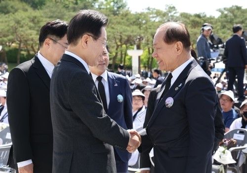 국민의힘 황우여 비상대책위원장과 더불어민주당 이재명 대표가 18일 광주시 북구 국립5·18민주묘지에서 열린 제44주년 5·18민주화운동 기념식에서 만나 악수하고 있다. 대통령실통신사진기자단 |