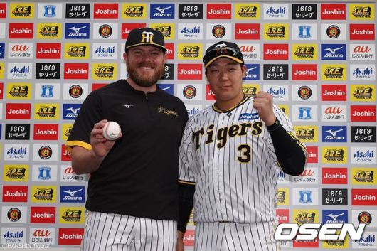 한신 투수 비즐리(왼쪽)와 오야마 유스케 / 한신 구단 홈페이지 |