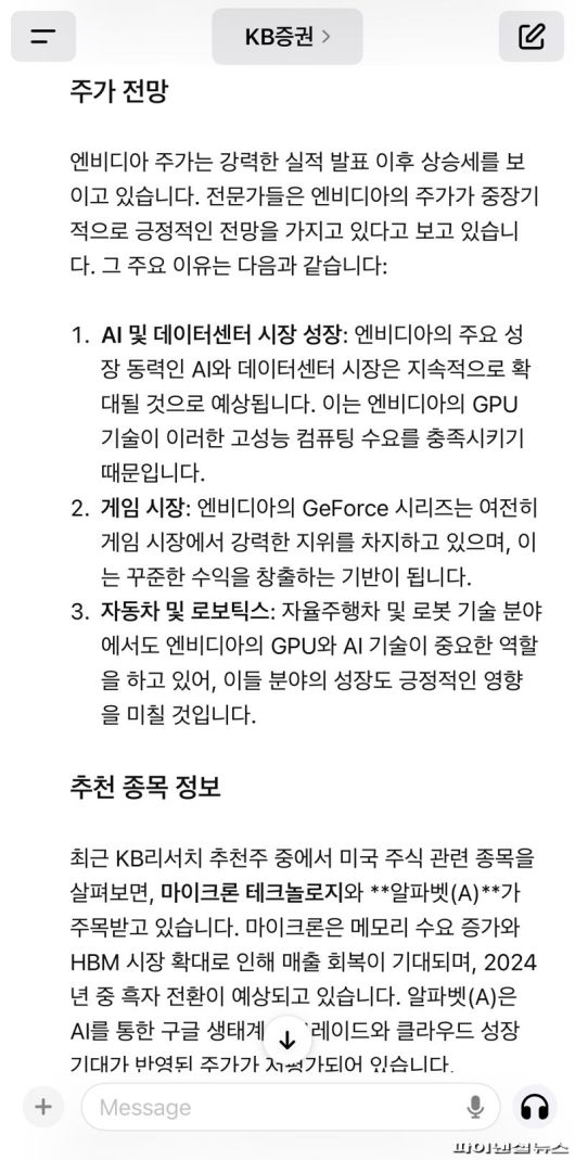 오픈AI의 생성형 인공지능(AI) 챗GPT를 통해 이용할 수 있는 'KB증권 GPT'에게 엔비디아 실적 및 주간 전망을 부탁하면 곧바로 답변을 얻을 수 있다. 다만 참고용 정보이므로 투자 결정은 개인의 책임이다. 사진=KB증권 GPT 답변 화면 갈무리 |