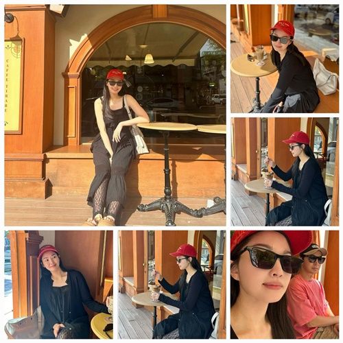 특히 류이서는 선명한 빨간색 모자와 큰 틀의 검은색 선글라스를 착용하고 있어, 강렬한 색상 대비가 그녀의 피부톤을 더욱 돋보이게 만들며 캐주얼하면서도 세련된 느낌을 준다.