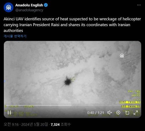 튀르키예 아나돌루 통신은 20일 현지에서 수색 중인 자국 아킨치 무인항공기(UAV)가 라이시 대통령이 탑승한 헬기의 잔해로 추정되는 열원을 파악해 이란 당국과 좌표를 공유했다고 엑스(X·옛 트위터)에서 전했다.