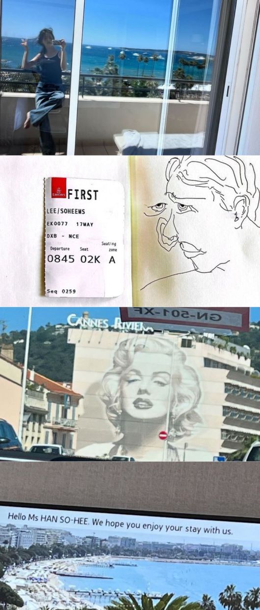 레드카펫 비하인드 컷과 더불어 직접 그린 것으로 보이는 그림, 마릴린 먼로의 얼굴이 그려진 벽화, 'Hello Ms HAN SO-HEE, We hope you enjoy your stay with us'(우리와 함께 즐거운 시간 보내길 바란다)라는 환영 문구 등을 공유했다.