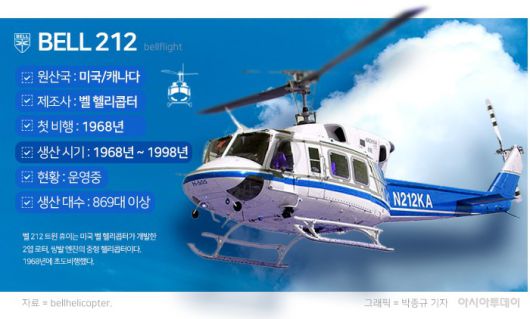 벨-212는 미국 업체인 벨 헬리콥터가 만든 헬기로 56년 전인 1968년 첫 생산을 시작해 1998년까지 생산했다. 민간 상업용으로 사용된 벨-212는 탑승 최대 가능 인원은 조종사 1명과 승객 14명 등 15명이다.