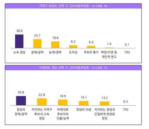 비례대표를 뽑는 정당투표에선 당의 정책·공약(30.8%)을 가장 많이 고려한 것으로 나타났다. 지지하는 지역구 후보자의 소속 정당(22.8%), 비례대표 후보자의 인물·능력(18.9%), 정당의 이념(14.1%), 지지하는 정당과 긴밀하게 연관된 정당(13.2%)이 뒤를 이었다.