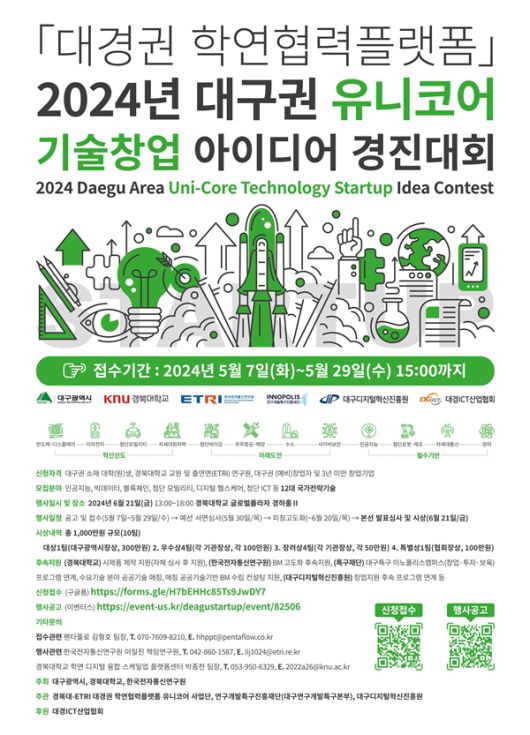 경북대·ETRI 대경권 학연협력플랫폼 유니코어 사업단은 ‘2024년 대구권 유니코어 기술창업 아이디어 경진대회’신청 접수를 지난 5월 7일부터 오는 29일까지 진행한다.