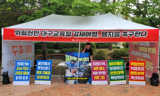 대구교사노조가 교육청의 숙박형 체험학습 강제 시행을 규탄하며 천막 농성을 벌이고 있다. 대구교사노조 제공 |
