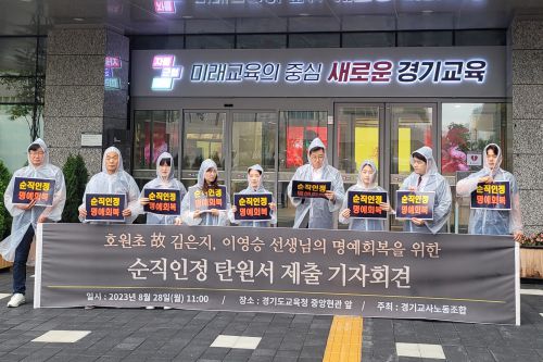 ‘호원초 사망 교사’ 순직 처리 요구 - 경기교사노조 등이 28일 수원에 있는 경기도교육청 앞에서 ‘호원초 고 김은지, 이영승 선생님의 명예회복을 위한 순직인정 탄원서 제출’ 기자회견을 하고 있다. 명종원 기자 |